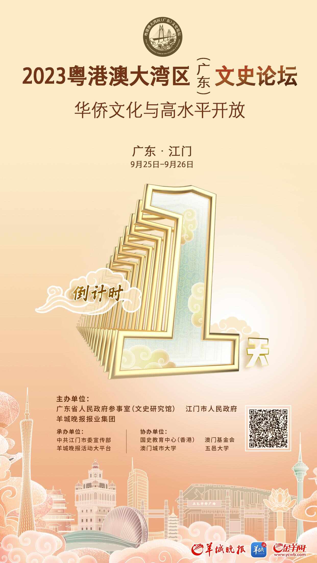 9月25日至26日,2023粤港澳大湾区(广东)文史论坛将在江门举行。本届论坛以“华侨文化与高水平开放”为主题,采用“1+3+1”的内容架构模式,即1场主论坛(开幕式),3场分论坛,1次调研活动。本届论坛由广东省人民政府参事室(文史研究馆)、江门市人民政府、羊城晚报报业集团主办,中共江门市委宣传部、羊城晚报活动大平台承办,国史教育中心(香港)、澳门基金会、澳门城市大学、五邑大学协办。
