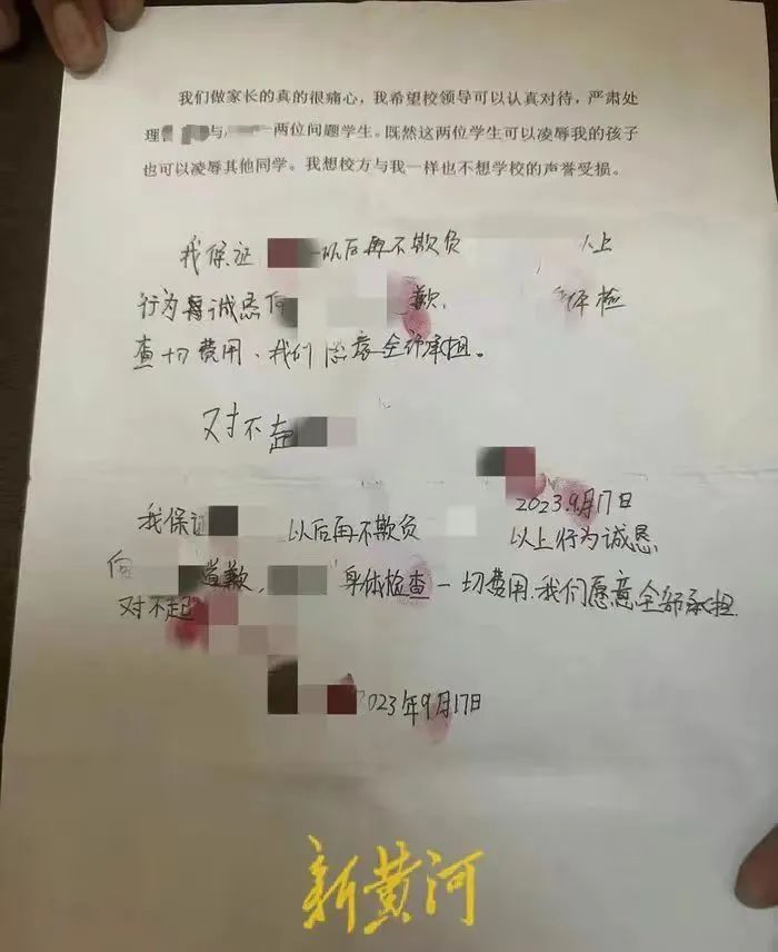9月17日,在校方安排下,三方家长在学校会面。同日,涉事两名学生家长在小强父亲打印的事件经过材料上,分别代其子写下道歉话语并表示愿承担相关检查费用。