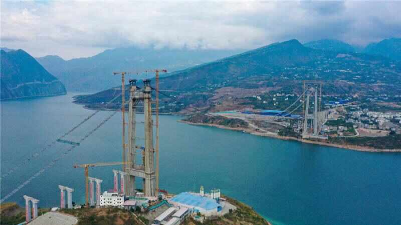 四川卡哈洛金沙江大桥是沿江高速公路控制性工程“三桥三隧”中技术最复杂、最具有代表性的控制性工程之一,位于四川凉山彝族自治州雷波县卡哈洛乡的溪洛渡电站库区,横跨金沙江,连接云南大永高速。大桥全长1817米(主跨1030米),为单跨双塔钢桁梁悬索桥,其新型框架基础重力式锚碇、内倾式钢管-混凝土格构柱、钢-混板桁结合桥道系,在悬索桥的历史上均属世界首创。
