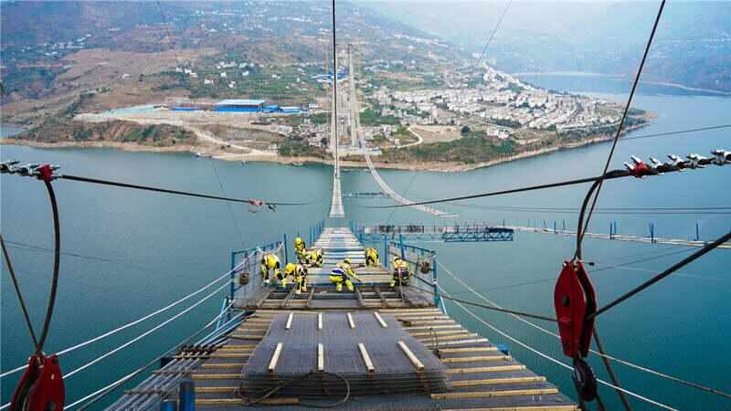 12月12日,由蜀道集团川高公司投资、四川路桥承建的沿江高速卡哈洛金沙江大桥喜迎进度条刷新,重达27.3吨重的钢索在空中“绣花”作业,成功完成首根主缆索股架设。