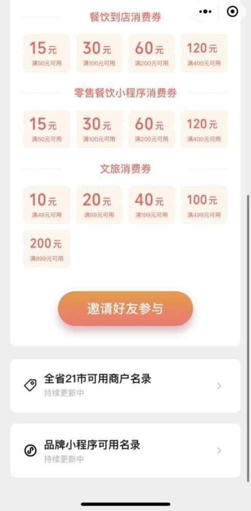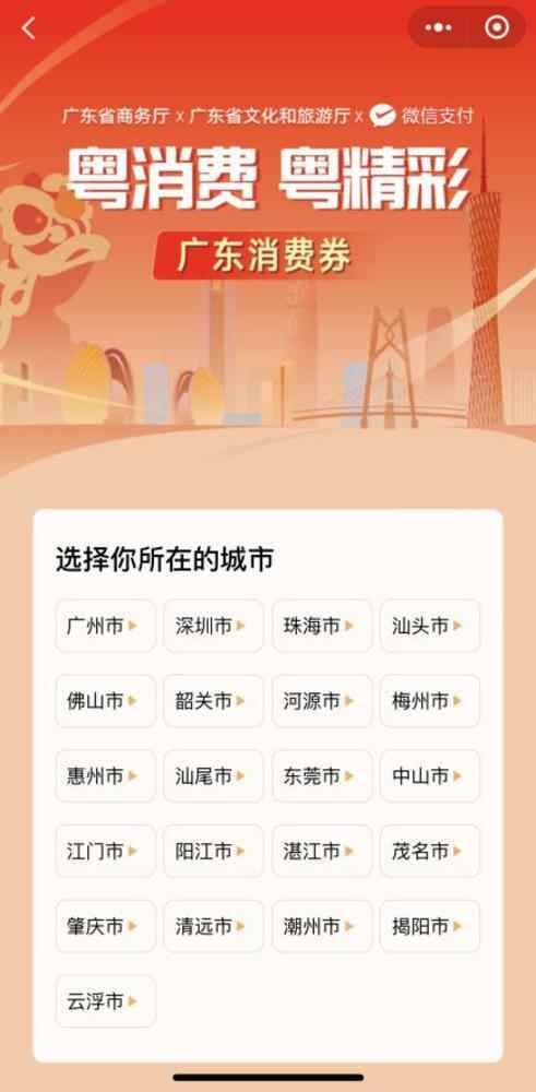 在核销方面,消费者可通过“广东消费券”微信小程序,点击“全省21市可用商户名录”或“品牌小程序可用名录”,选择你所在的城市,搜索、查看参与此次活动的所有商户。