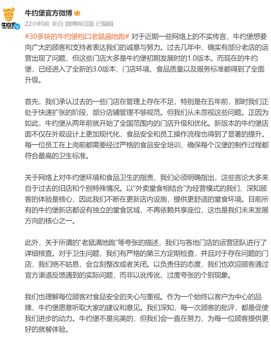 9月7日,牛约堡官方微博再次发文回应网上关于食品安全问题的质疑,称网上对牛约堡环境和食品卫生的指责大多来自过去的旧店和个别特殊情况。对于卫生问题,公司有严格的第三方定期检查,对于有问题的门店绝不姑息,会立刻整改或关闭。公司欢迎顾客通过官方渠道反馈遇到的实际问题,而非以讹传讹、过度夸张个别现象。
