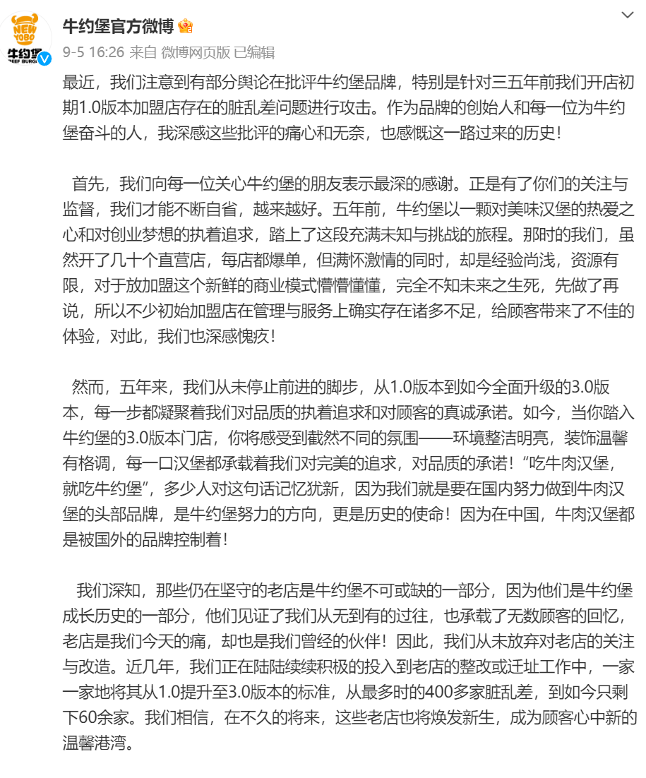 9月5日,牛约堡通过官方微博承认问题存在,并表示已在改进。同时表示,将对门店形象进行全面升级。合同即将到期且从未进行过形象升级的老加盟商,在合同到期前,按照其最新版的标准形象进行统一升级。