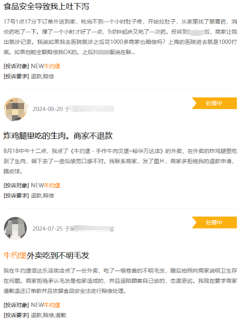 而在某投诉平台上,涉及牛约堡食品安全问题的投诉也不少。
