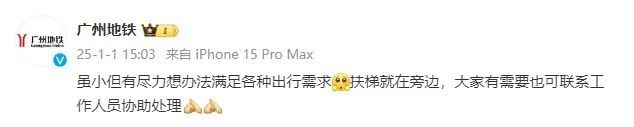 1月1日下午,@广州地铁 也发文回应:“虽小但有尽力想办法满足各种出行需求。扶梯就在旁边,大家有需要也可联系工作人员协助处理。”