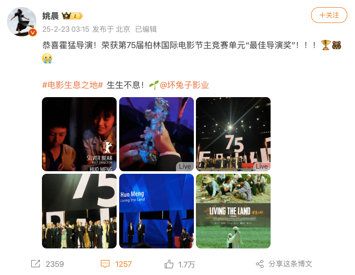 2月23日凌晨,姚晨在个人社交媒体发文恭喜霍猛导演。