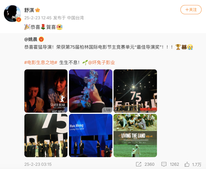 《生息之地》柏林电影节获奖 网友:姚晨闷声干大事