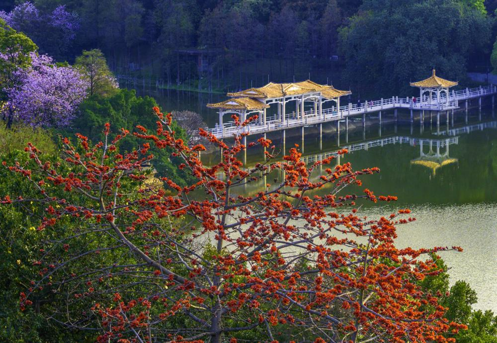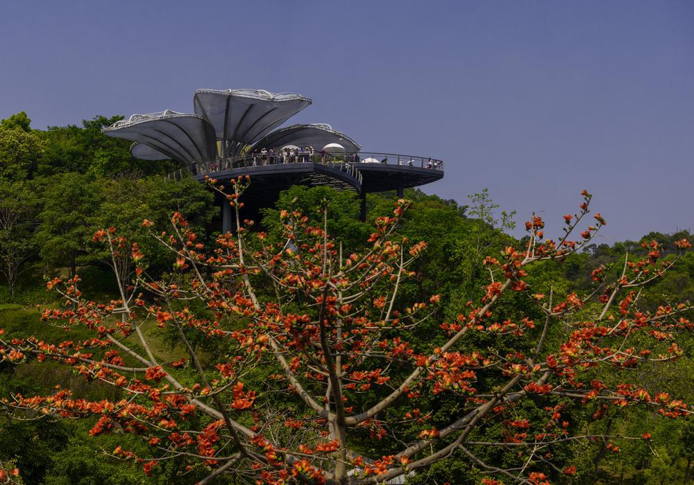 游客既可在此平视盛放的火焰状花冠,又能俯瞰白云山林海与城市天际线交融的独特画卷。作为木棉科植物专类园与科研保育基地,这里汇聚了12种、200余株木棉科植物,园区同步推出高空木棉主题下午茶及弦乐表演,让木棉茶点与花影琴韵一同打造沉浸式赏花体验,实现从植物观赏到多维文化体验的升级跨越。