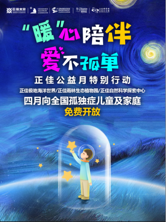 活动内容:在4月2日世界孤独症关注日来临之际,广州正佳集团启动了“正佳公益月”特别行动,宣布2025年4月1日至4月30日,广州正佳极地海洋世界、正佳雨林生态植物园、正佳自然科学探索中心将向全国16周岁(含)以下孤独症儿童及一位家长免费开放。