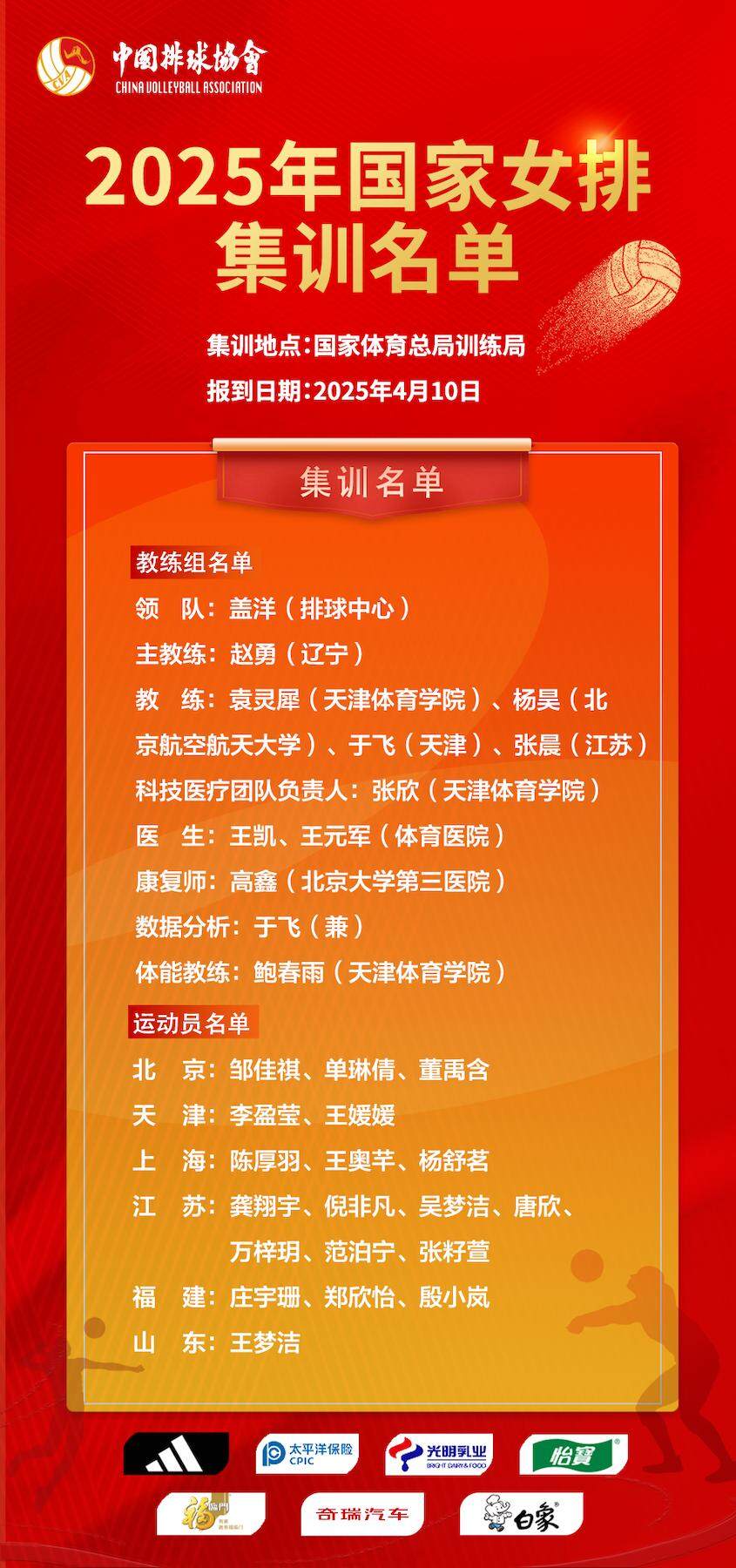 2025年国家女排集训名单公布,赵勇任主帅