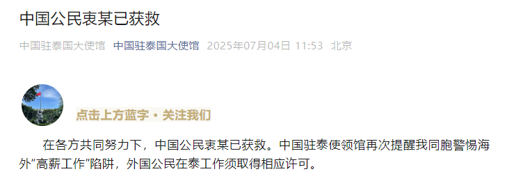 中国驻泰国大使馆7月4日发布消息,在各方共同努力下,中国公民衷某已获救。中国驻泰使领馆再次提醒我同胞警惕海外“高薪工作”陷阱,外国公民在泰工作须取得相应许可。