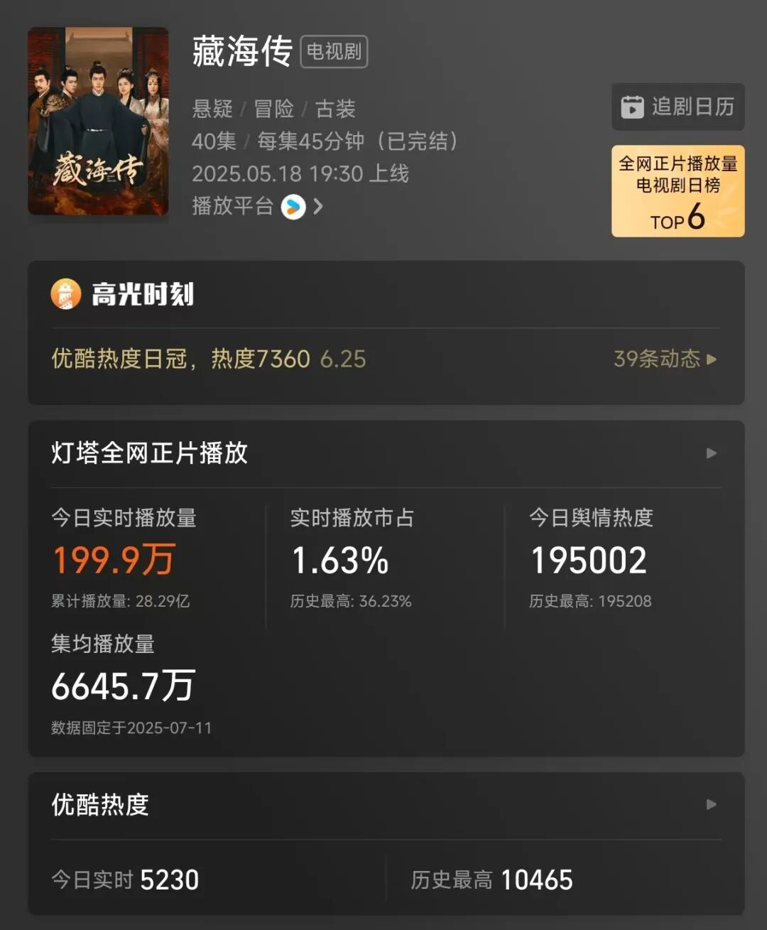 SBS媒体网报道了《藏海传》在中国播出后创下的多项纪录:历史古装剧收视率总榜第二、近五年播出的古装剧中最高收视率、2025年唯一市场占有率突破40%的电视剧、单日最高播放量突破1亿次,并在优酷平台刷新了历史最高预约量及人气指数纪录。