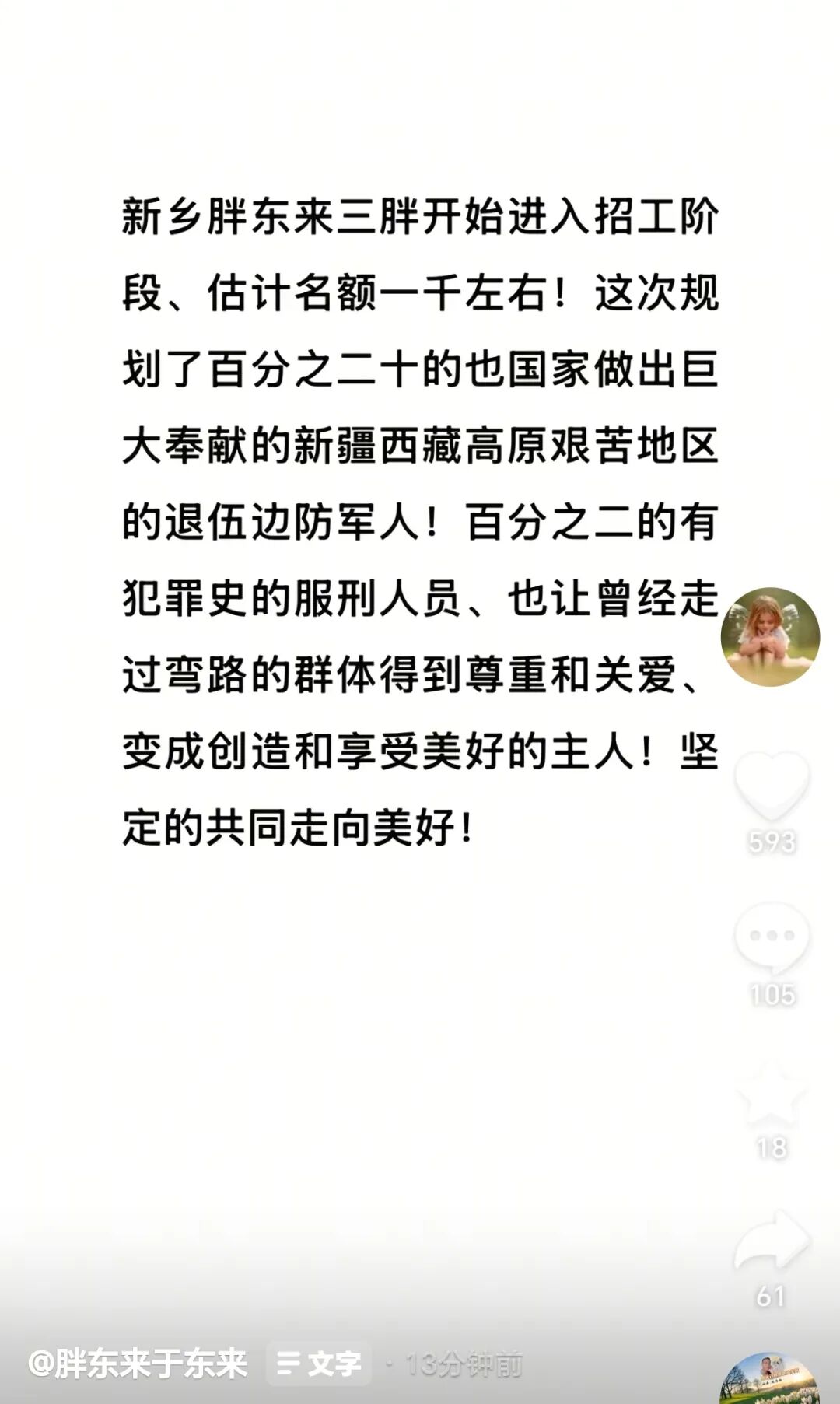 近日,胖东来创始人于东来在社交平台发布消息,新乡胖东来三胖开始进入招工阶段,此次预计招工名额在1000人左右。