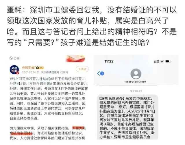 8月6日,有网友发文反映称,自己收到深圳卫生健康委短信告知,因其未办理结婚登记生育,不属于符合法律、法规规定生育子女,无法领取相关育儿补贴,相关贴文立即引起网友热议。