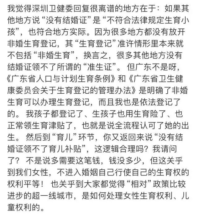 该网友进一步表达了对上述回复的不解,因为根据《广东省人口与计划生育条例》和《广东省卫生健康委员会关于生育登记的管理办法》,明确了非婚生育可以办理生育登记。“我也是依法登记了的。我孩子都登记了,生孩子也用生育险了,也正常领生育津贴了,也就是说全流程认可了她的出生。”