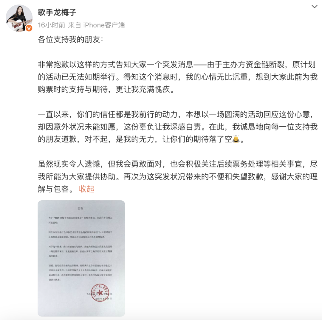 8月14日,歌手龙梅子在社交平台发文致歉,称由于主办方资金链断裂,演唱会无法如期举行。