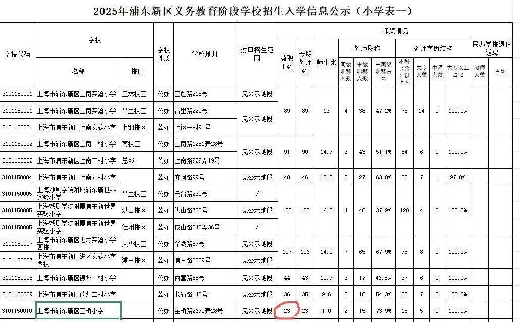 8月28日,羊城晚报记者查阅浦东新区教育局于今年4月7日公布的《2025年浦东新区义务教育阶段学校招生入学信息公示(小学)》发现,上海市浦东新区三桥小学目前办学规模为班级数5个,学生22人;专职教师人数为23人。