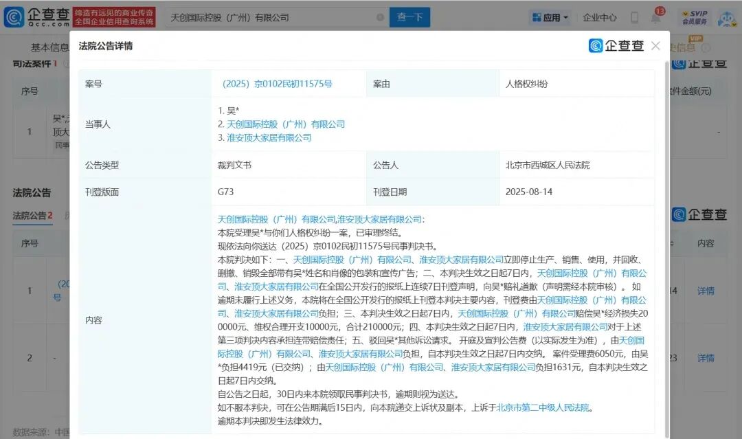 企查查App显示,近日,北京市西城区人民法院公告送达吴京与天创国际控股(广州)有限公司、淮安顶大家居有限公司人格权纠纷民事判决书。判决书显示,天创国际控股(广州)有限公司、淮安顶大家居有限公司立即停止生产、销售、使用,并回收、删撤、销毁全部带有吴京姓名和肖像的包装和宣传广告,并向吴京赔礼道歉。