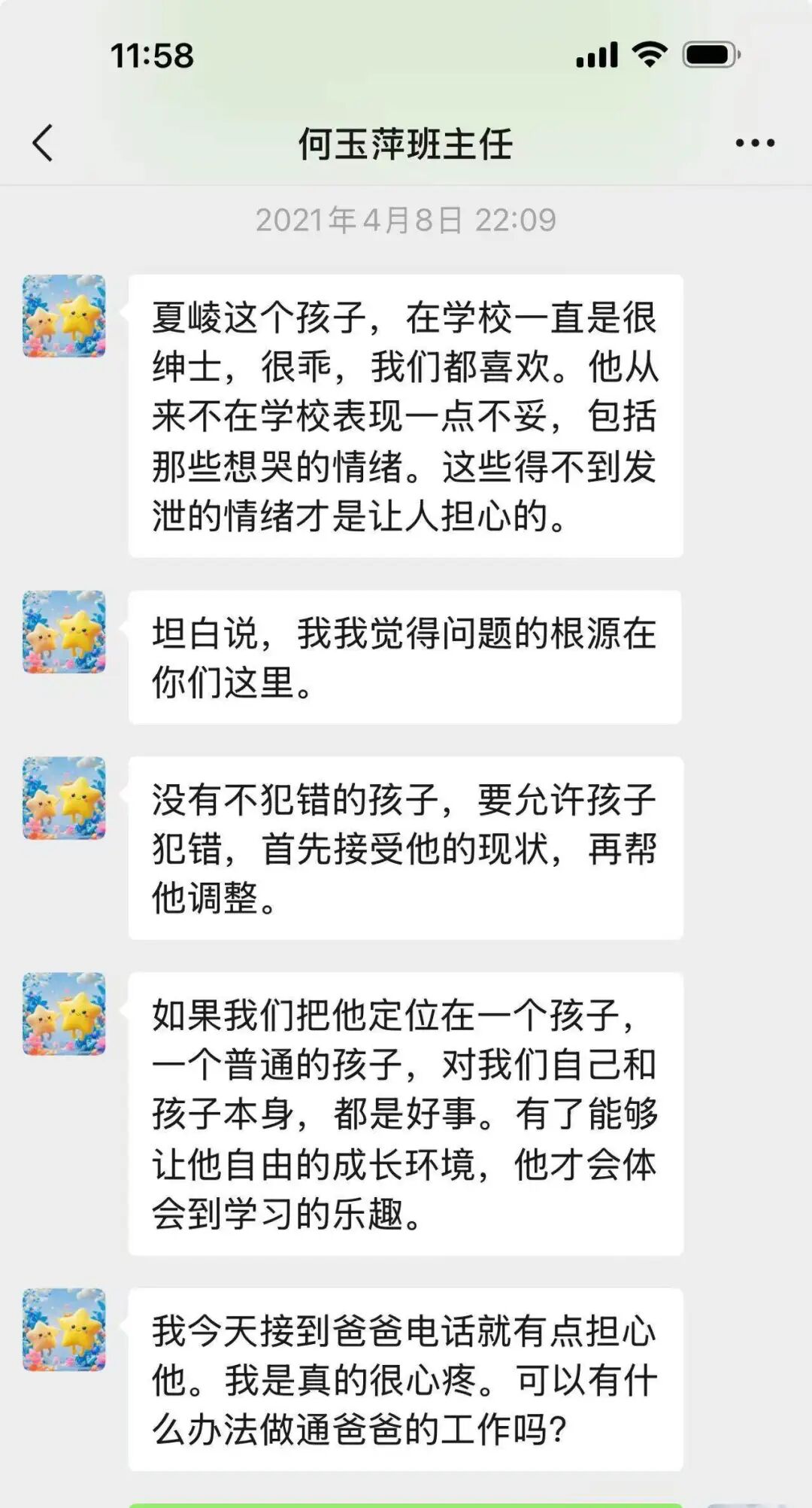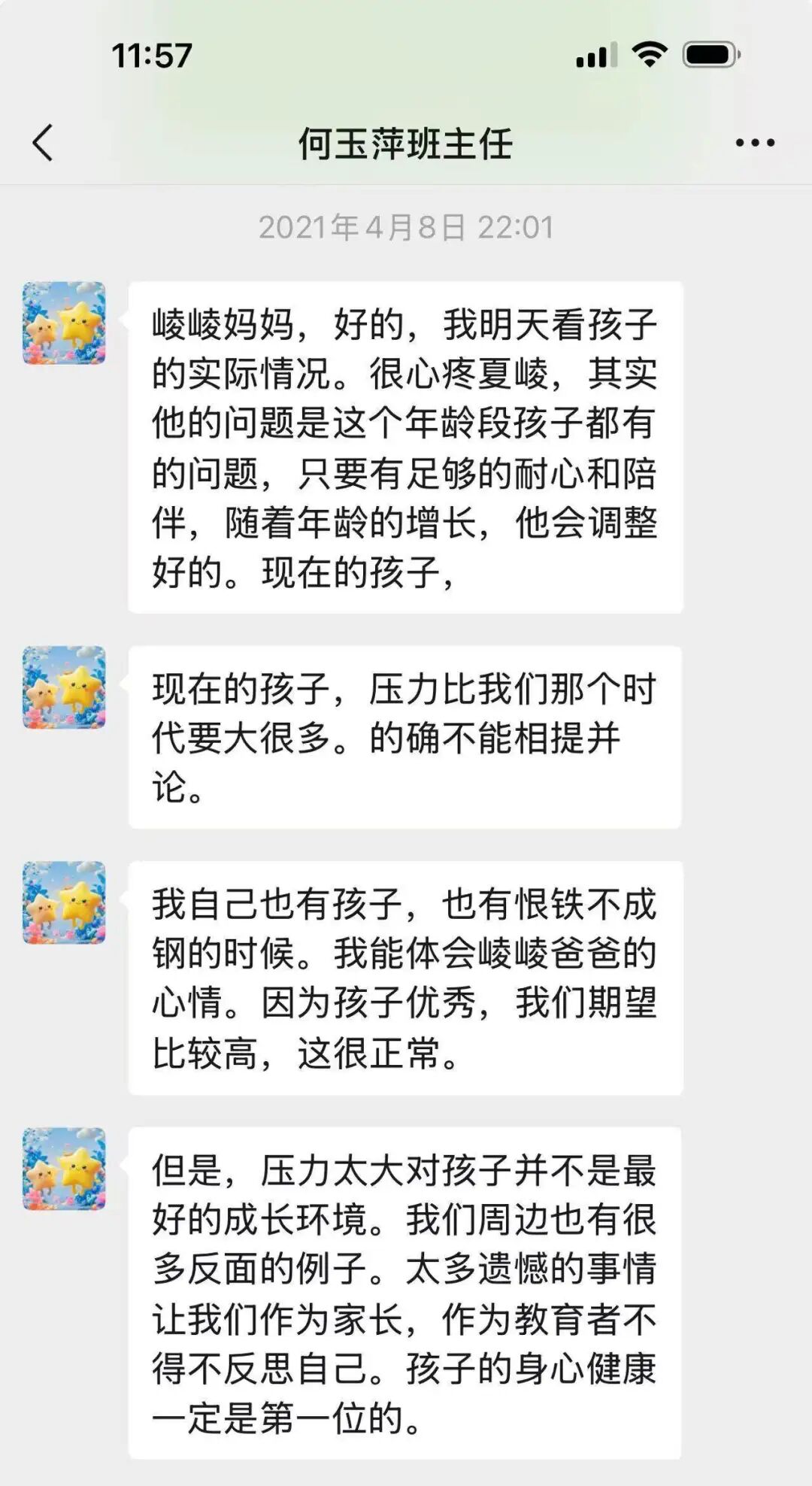 时至今日,冯夏崚一家都非常感谢何玉萍老师当年及时发现夏崚的心理波动,以及对父母教育方式的及时纠偏。四年多过去,冯妈妈的手机里依然保留着当年和老师沟通的微信记录。