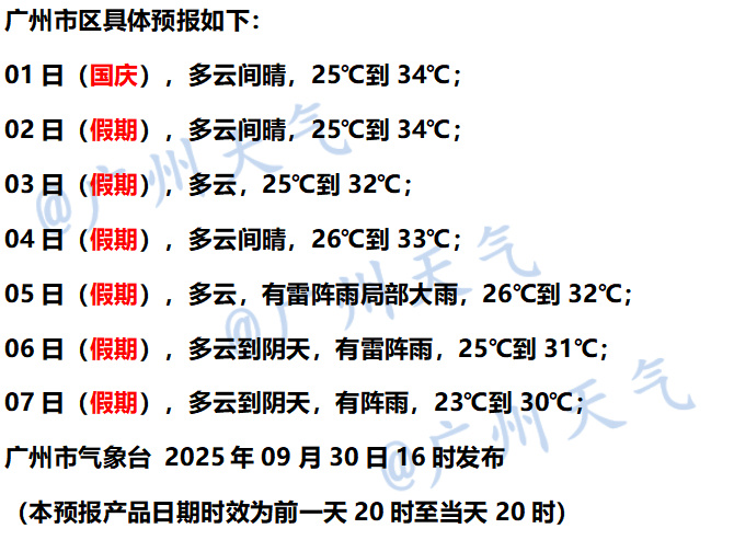 @广州天气 表示,国庆日天气不错,长假的前半段也非常适合出门,但要注意防晒和及时补充水分。
