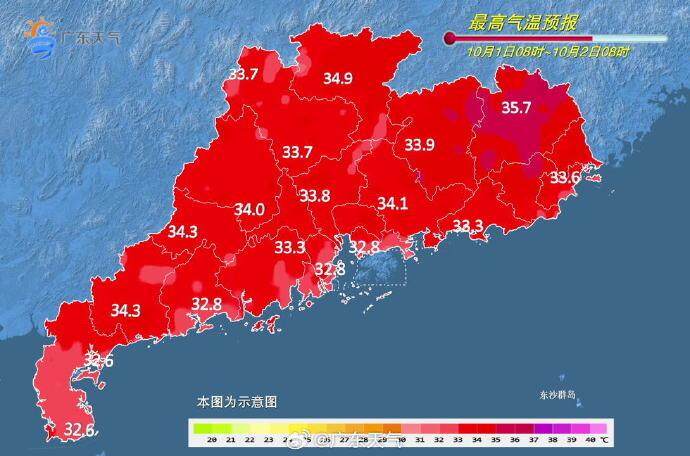 10月1日-4日,广东大部分市县晴到多云为主,局部有(雷)阵雨。最高气温:中北部市县33~35℃,局部36℃左右,其余市县30~33℃。