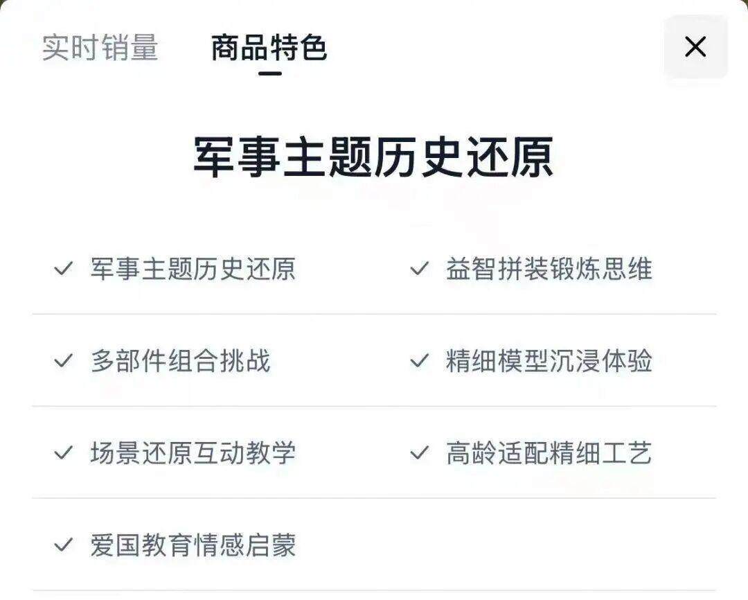 该款玩具共有8小盒,包装盒上均被标注了“铭记历史”字样,还显示具有“爱国教育情感启蒙”,“军事主题历史还原”等特色。