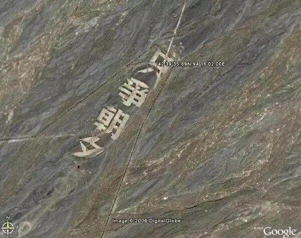 据哈密文旅,在哈密市东南方骆驼圈子戈壁,200米高度俯视,可以清晰看见地面显示“毛主席万万岁!”“为人民服务”等字迹,每个字有半个足球场大。当年在八航校任导航主任的季臣业是这些地标大字的设计者。