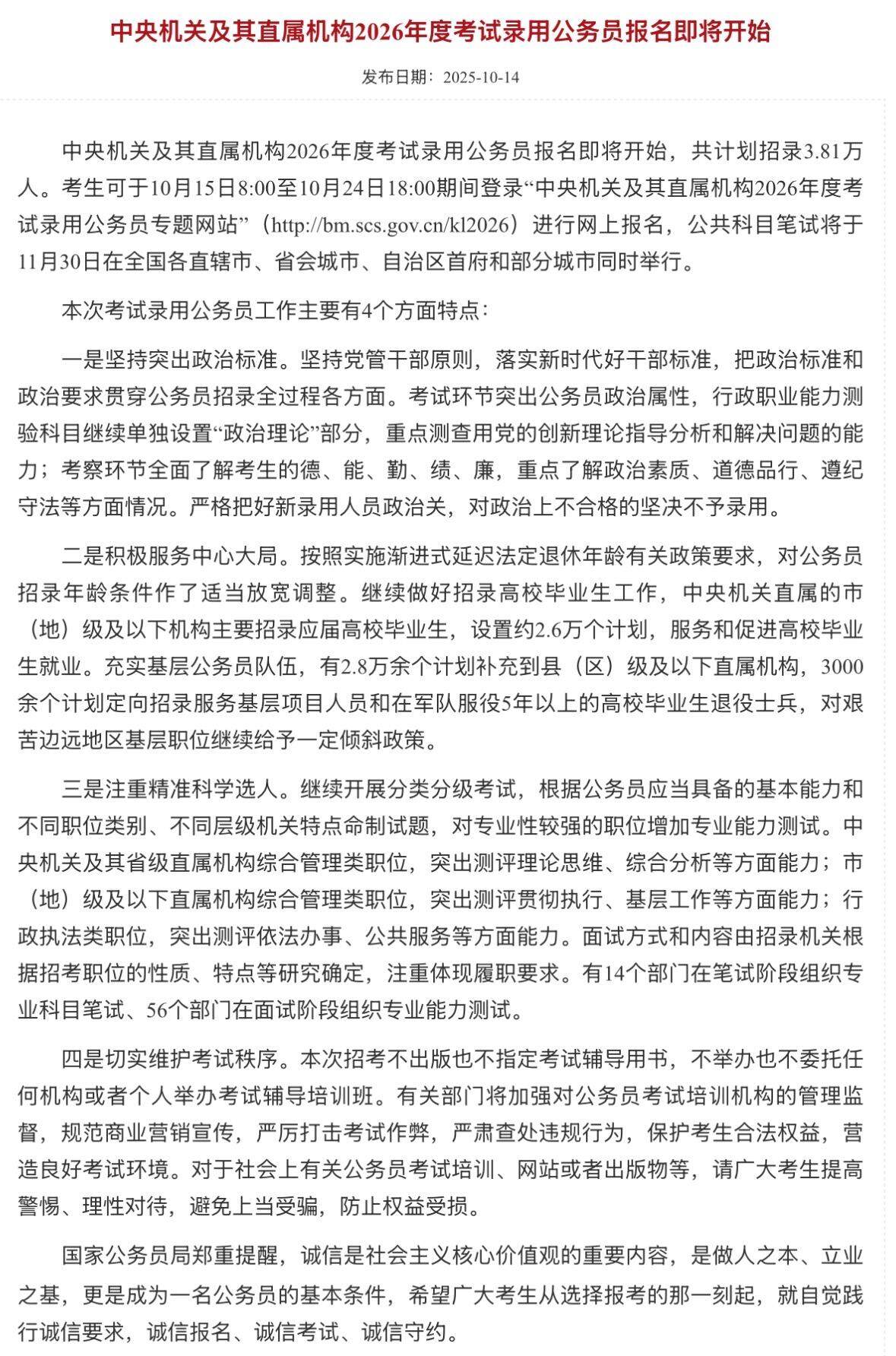 10月14日,2026年国家公务员考试公告正式发布。本次国考计划招录3.81万人,较2025年的3.97万人略有缩减。值得关注的是,本次国考对报考年龄限制进行了放宽,最高报考年龄调整至38周岁,而2026年应届硕士、博士研究生则可放宽至43周岁以下。羊城晚报采访的专家特别提醒考生,重点关注报考职位表,以及国考考情、报考数据、选岗策略、备考工具等核心内容,可以“三步选岗法”作为指南。