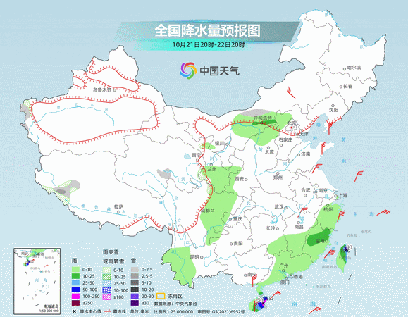 至到22日,台湾岛、广东南部沿海、海南岛东部和南部、福建东部等地有中到大雨,局地暴雨或大暴雨。其中强降雨集中在台湾岛,中北部有大到暴雨,东北部部分地区有大暴雨。21日至22日白天,广东沿海及海南岛降雨也将增强,有中到大雨,局地暴雨。