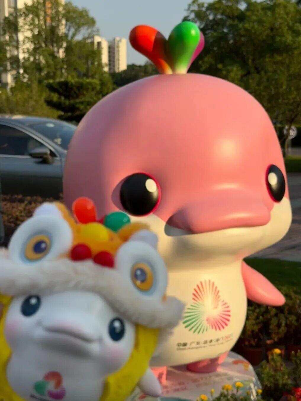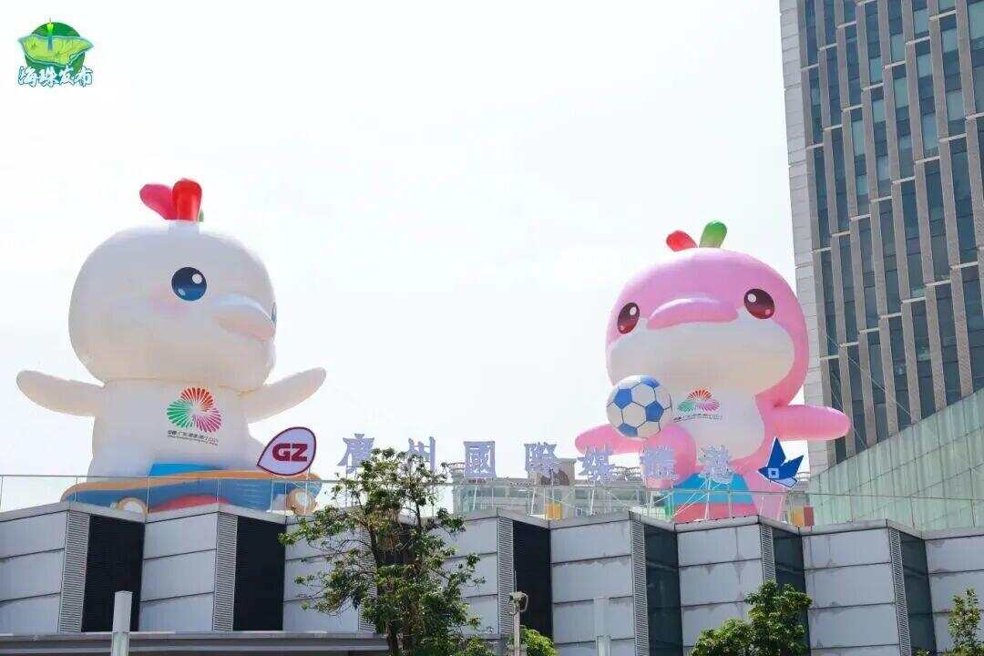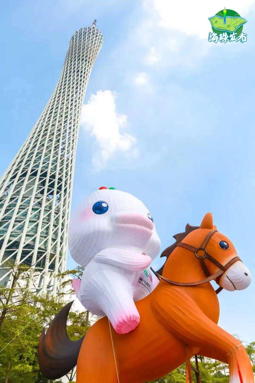 广州塔广场、国际媒体港、广州塔财富码头......吉祥物“喜洋洋”和“乐融融”随处可见。