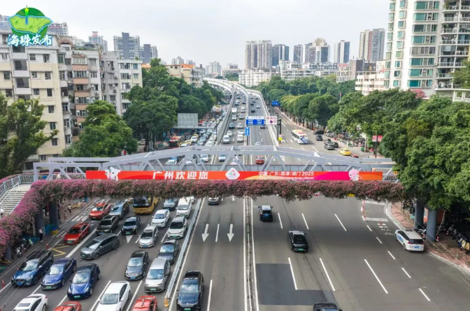 广州大桥、海印桥、江湾桥、江南大道、江海大道等人行天桥设置了十五运会主题大型横幅“广州欢迎您”“激情全运会 活力大湾区”,标语下是川流不息的车流,赛事氛围感拉满!