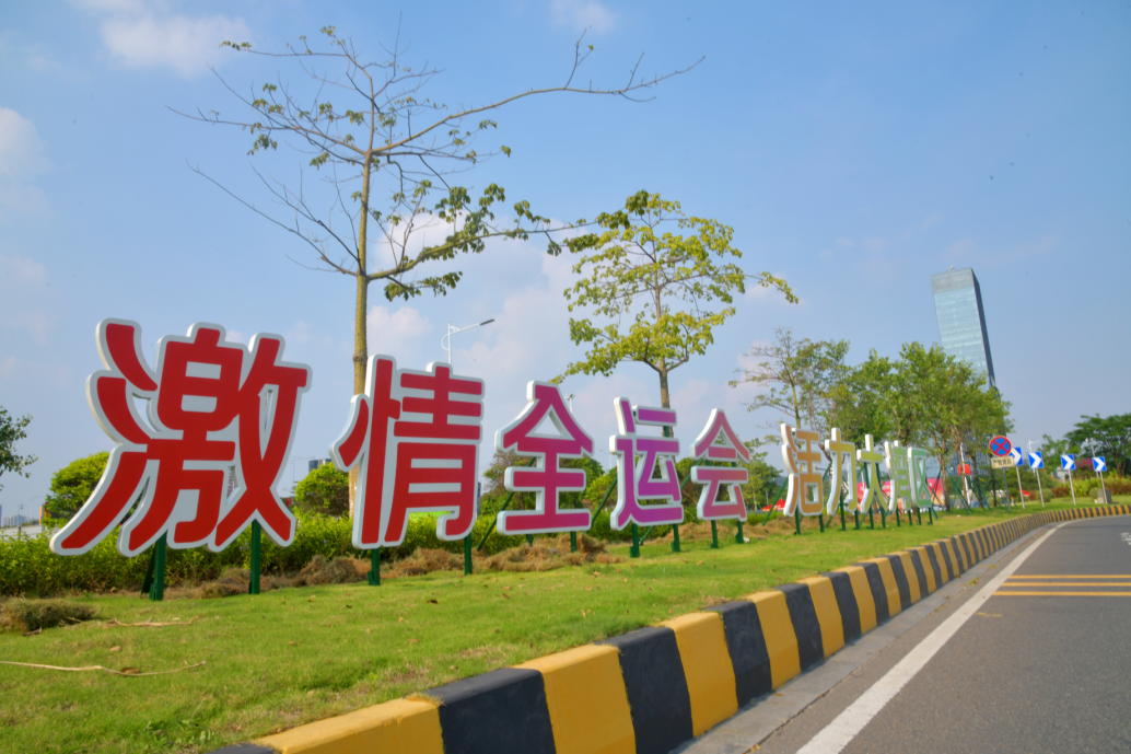 移步花城广场,全运装置与城市新中轴线相得益彰。“激情全运会,活力大湾区”等振奋人心的标语,在蓝天白云映衬下格外醒目。
