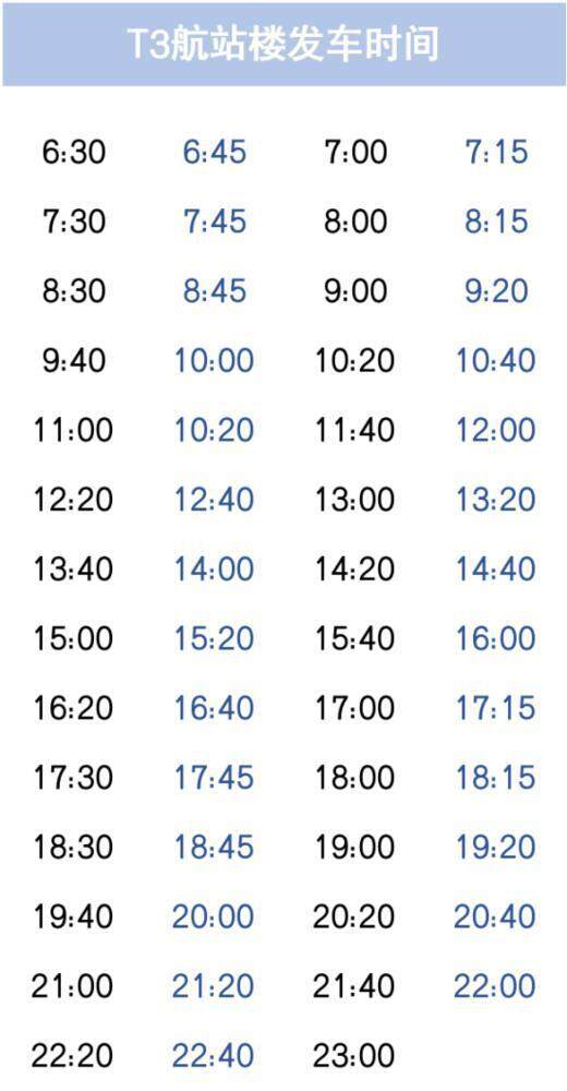 【T3航站楼公交专线】线路单程约6公里,用时约15分钟,发车间隔为15-20分钟。计划发车时刻表如下: