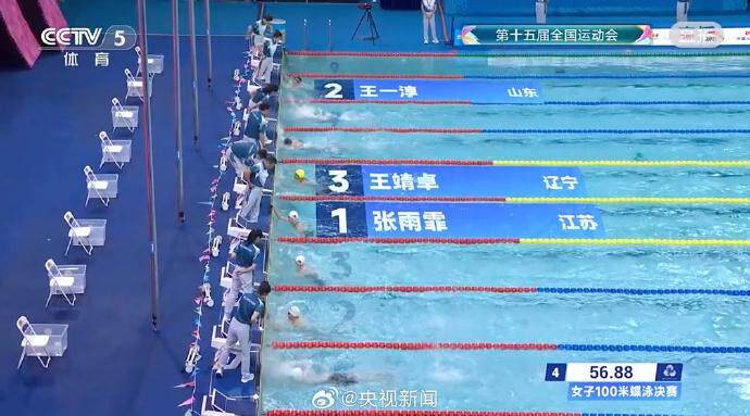 11月11日,全运会女子100米蝶泳决赛,张雨霏游出56秒88,夺得金牌!