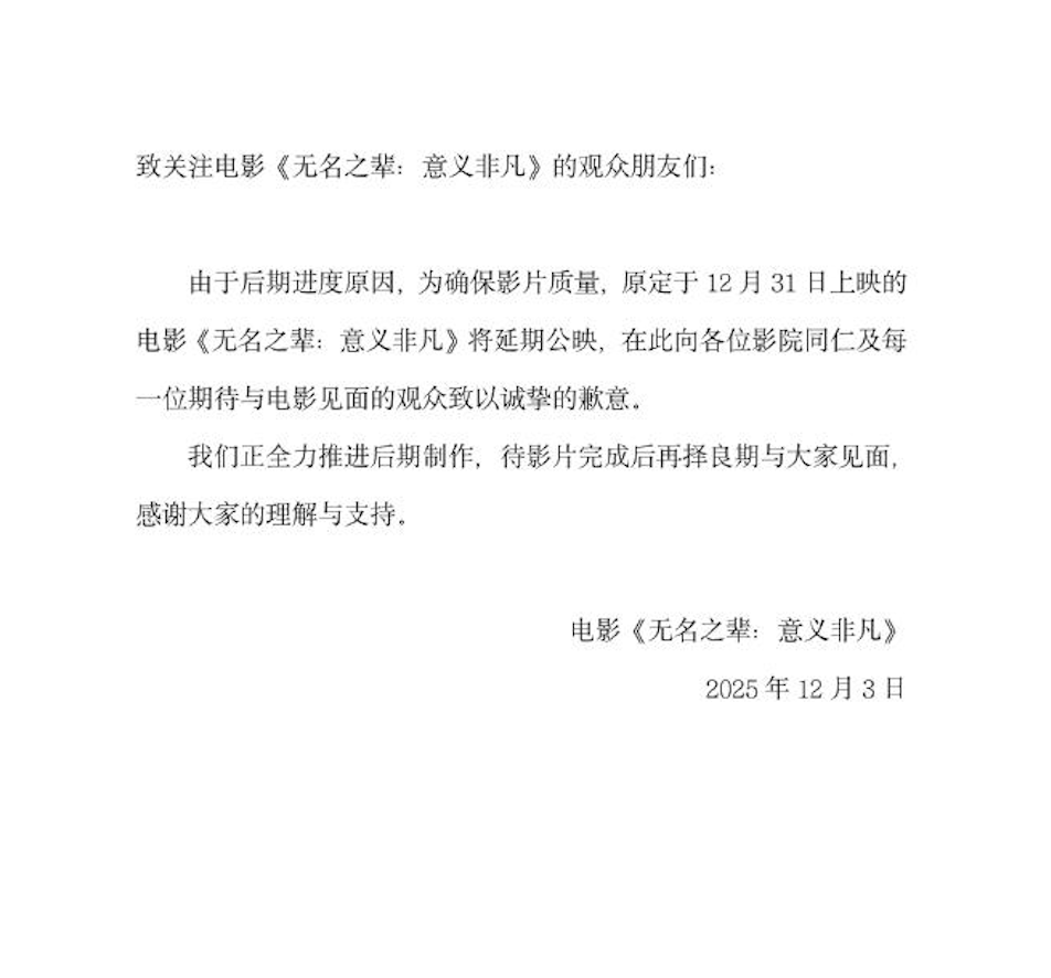 电影近日发布声明,称由于后期进度原因,为确保影片质量,原定于12月31日上映的该片将延期公映。