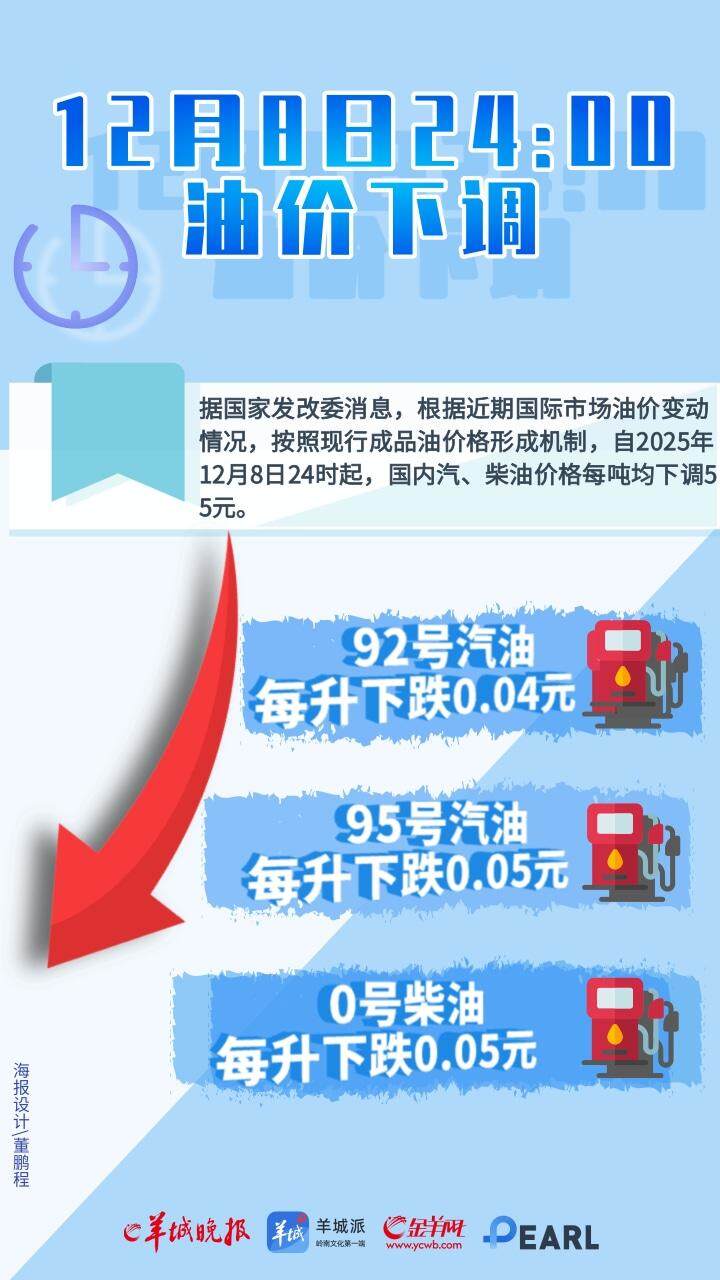 12月8日,羊城晚报记者从国家发改委官网获悉,根据近期国际市场油价变化情况,按照现行成品油价格形成机制,自2025年12月8日24时起,国内汽、柴油价格(标准品,下同)每吨均下调55元。折合升价92#汽油、95#汽油、0#柴油分别下调0.04、0.05、0.05元。