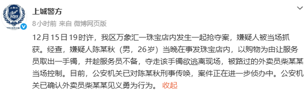 12月16日凌晨,上城警方发布通报:12月15日19时许,我区万象汇一珠宝店内发生一起抢夺案,嫌疑人被当场抓获。