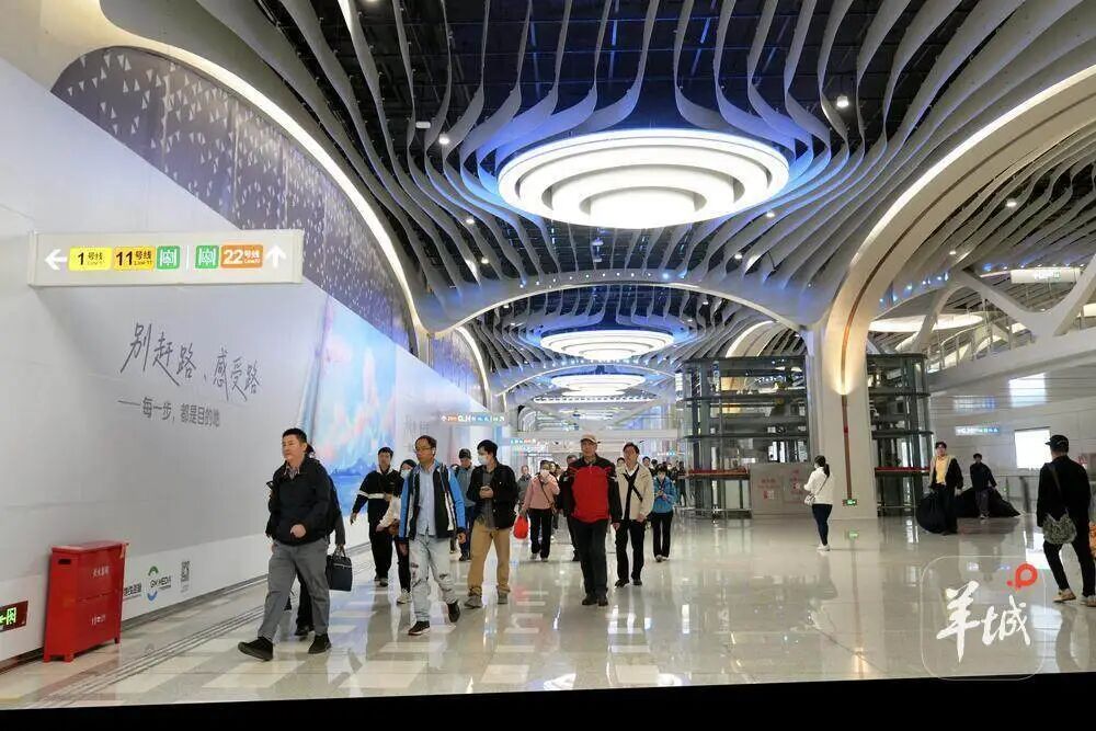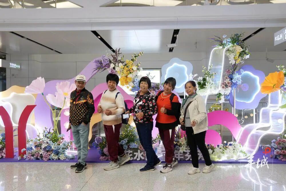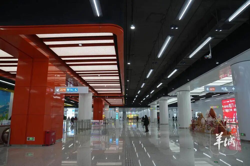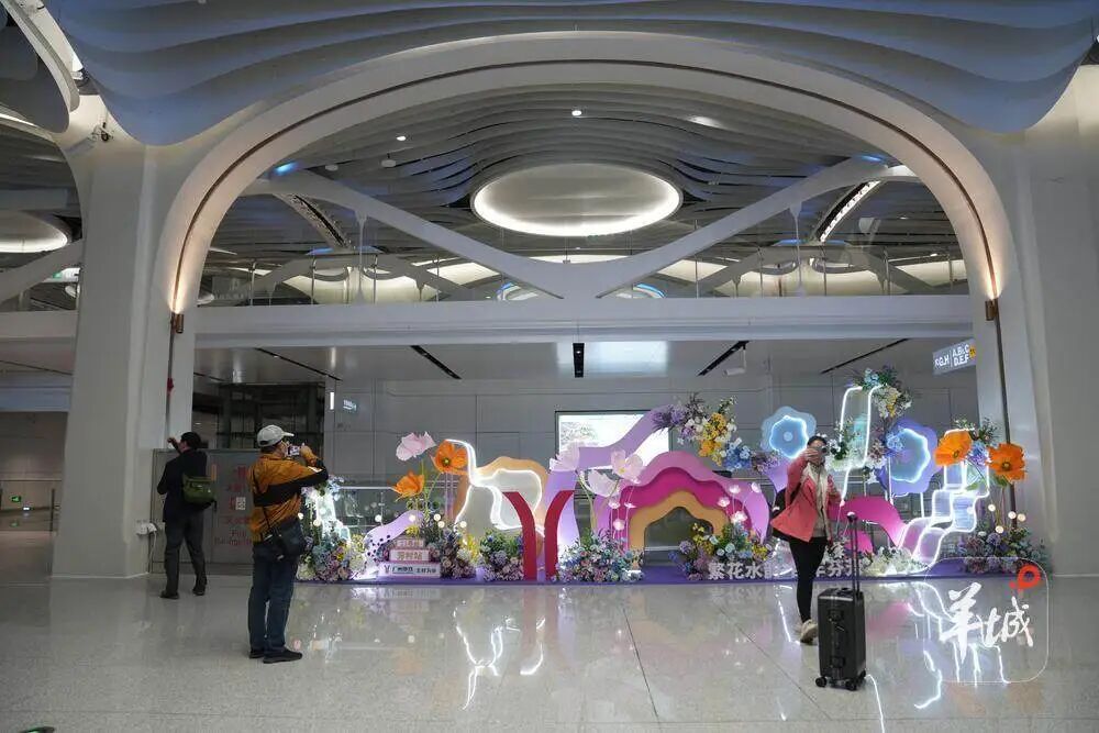 为庆贺新线开通,广州地铁在芳村站与西塱站精心布置了大型主题花艺景观与打卡点。29日8时30分,在二十二号线芳村站站厅,乘客们来来往往,街坊们纷纷在新站厅拍照打卡。陈女士提着行李箱,准备乘坐新线前往广州南站出差。“我住在芳村站附近,以前出差时需要去南站一号线转二号线,或者打车,耗时要40分钟或更久。今天新线开通,坐地铁17分钟就能到广州南站,太快了!”陈女士兴奋地说。
