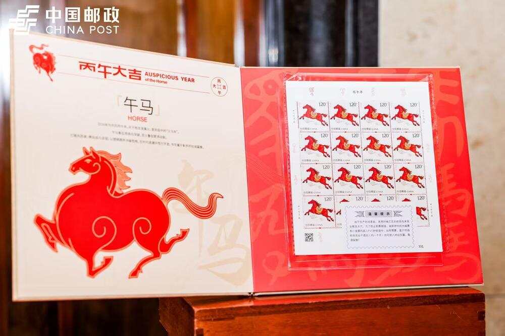 《丙午年》特种邮票由中国邮政发行,由王红卫、赵恩重设计。邮票中的骏马既展现出“一马当先”的开拓气概,也诠释了“万马奔腾”的团结力量,将马的形象与新时代中国人民奋发进取的精神风貌完美融合于方寸之间。