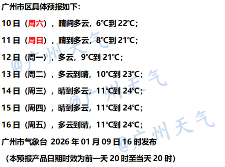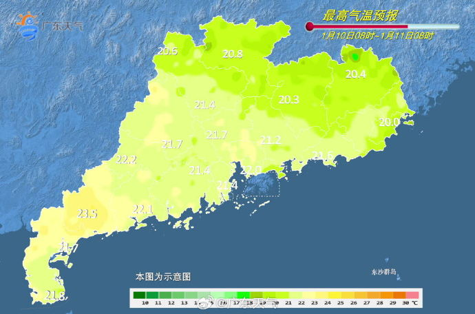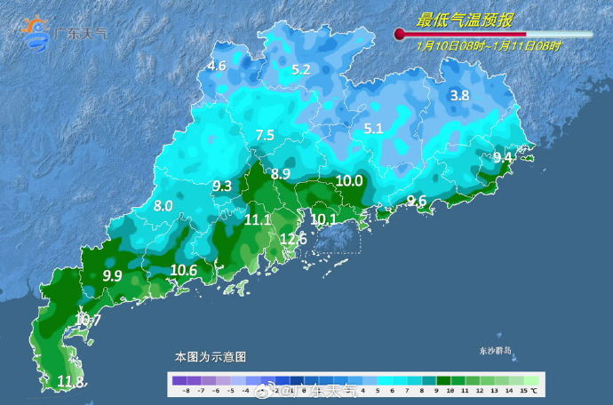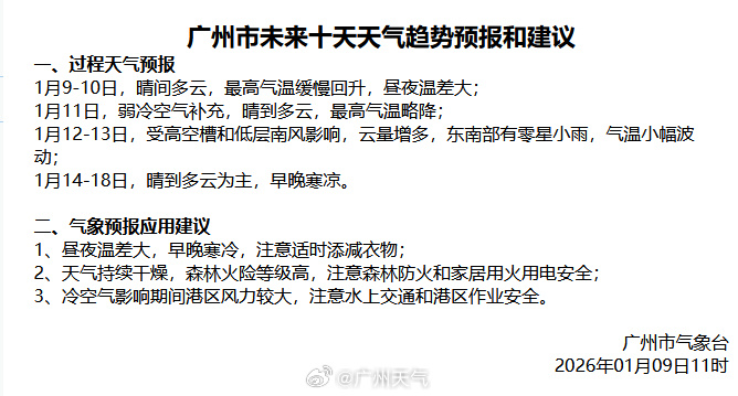 1月10日到1月11日,广东全省都置于偏北气流控制中,日间阳光撒辉,晨晚晴空辐射,利于降温,粤北市县仍有5℃以下低温,局部有霜冻,注意防寒保暖。