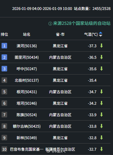 说到冬景就不得不关注东北地区的情况,看看中国地图最北端的气温,光看就已经冷得不行了。随着冷空气接连影响,这一带地区最低气温还会更低,甚至出现-40℃的极寒低温。