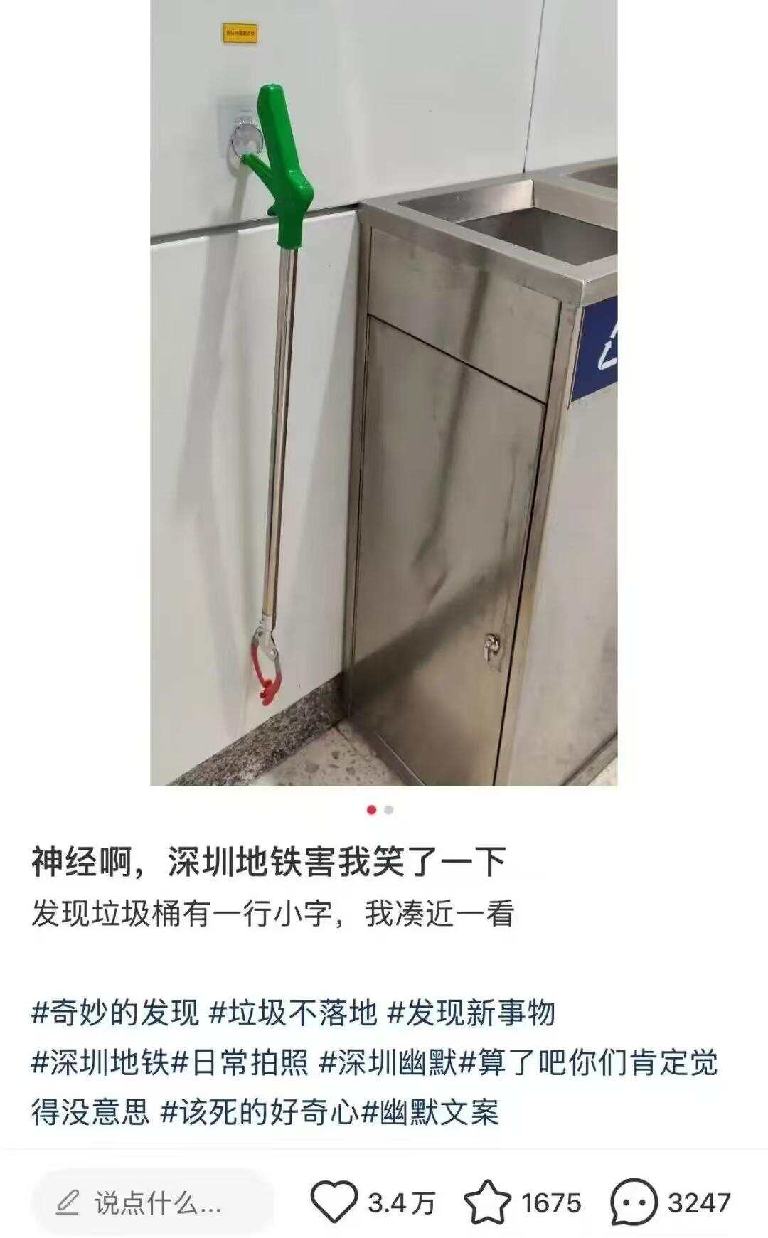 2025年12月,深圳地铁10号线的垃圾桶旁,悄悄贴出一句提示语——“美化环境靠大夹”(谐音“大家”),旁边还配套摆放着清洁长夹,自当月起在该线路全线推广,成了通勤路上的小惊喜。2026年1月8日,小红书用户@赚辛苦钱 花冤枉钱 发布图文称“深圳地铁害我笑了一下”,这句带点口音的谐音标语引起了网友的关注。随后,相关话题登上社交平台热搜,网友们纷纷晒出各地的趣味标语,一场关于城市幽默感的讨论就此升温。