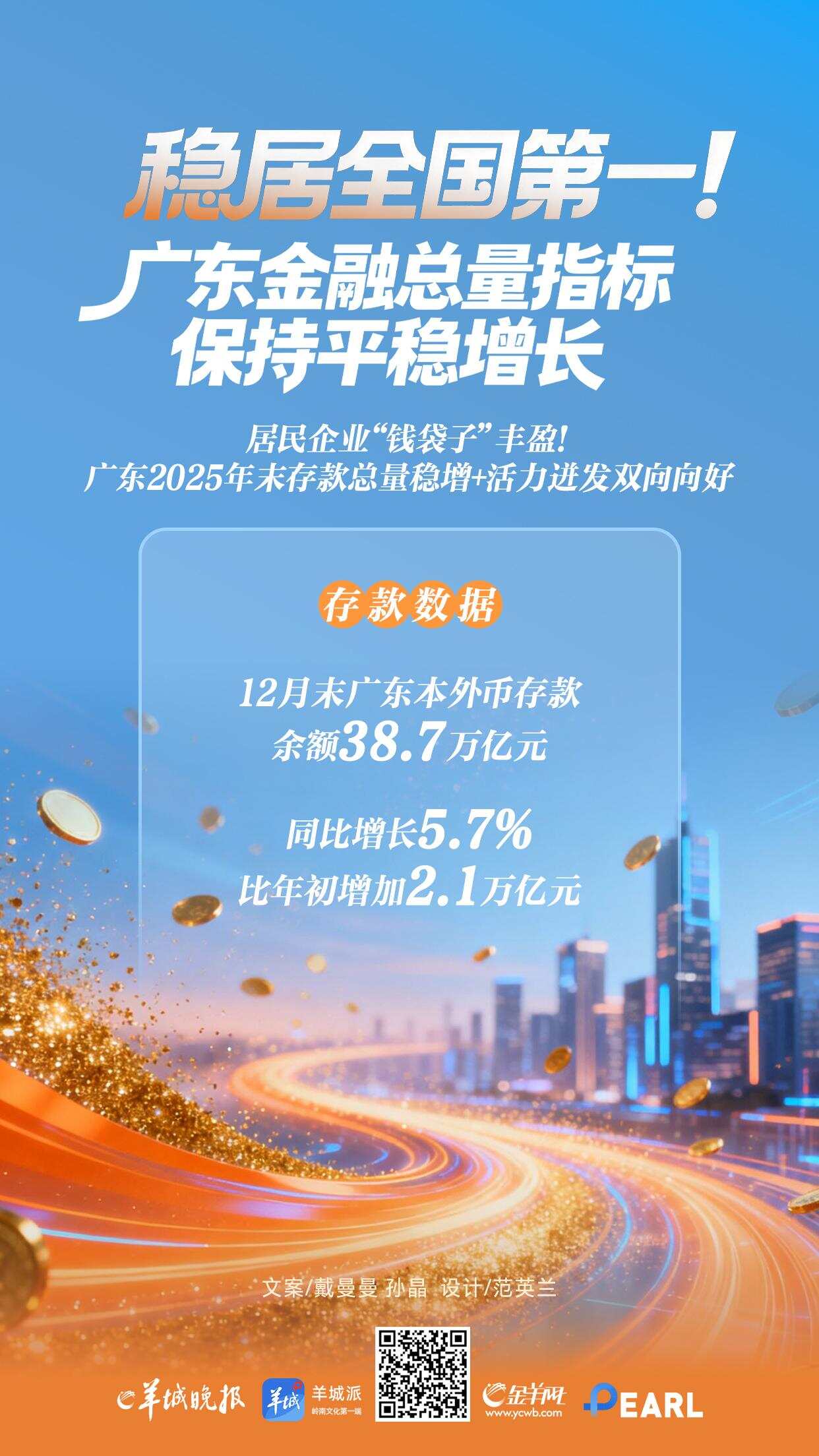 羊城晚报讯 记者戴曼曼报道:38.7万亿元存款、29.9万亿贷款,广东金融总量继续稳居全国第一!1月16日,记者从中国人民银行广东省分行获悉,截至2025年末,广东本外币各项存款余额38.7万亿元,同比增长5.7%,是全国唯一存款规模超30万亿元的省份。本外币各项贷款余额29.9万亿元、同比增长5.4%,比年初增加1.5万亿元、同比多增2822亿元,投向实体部门的信贷资金明显增多。
