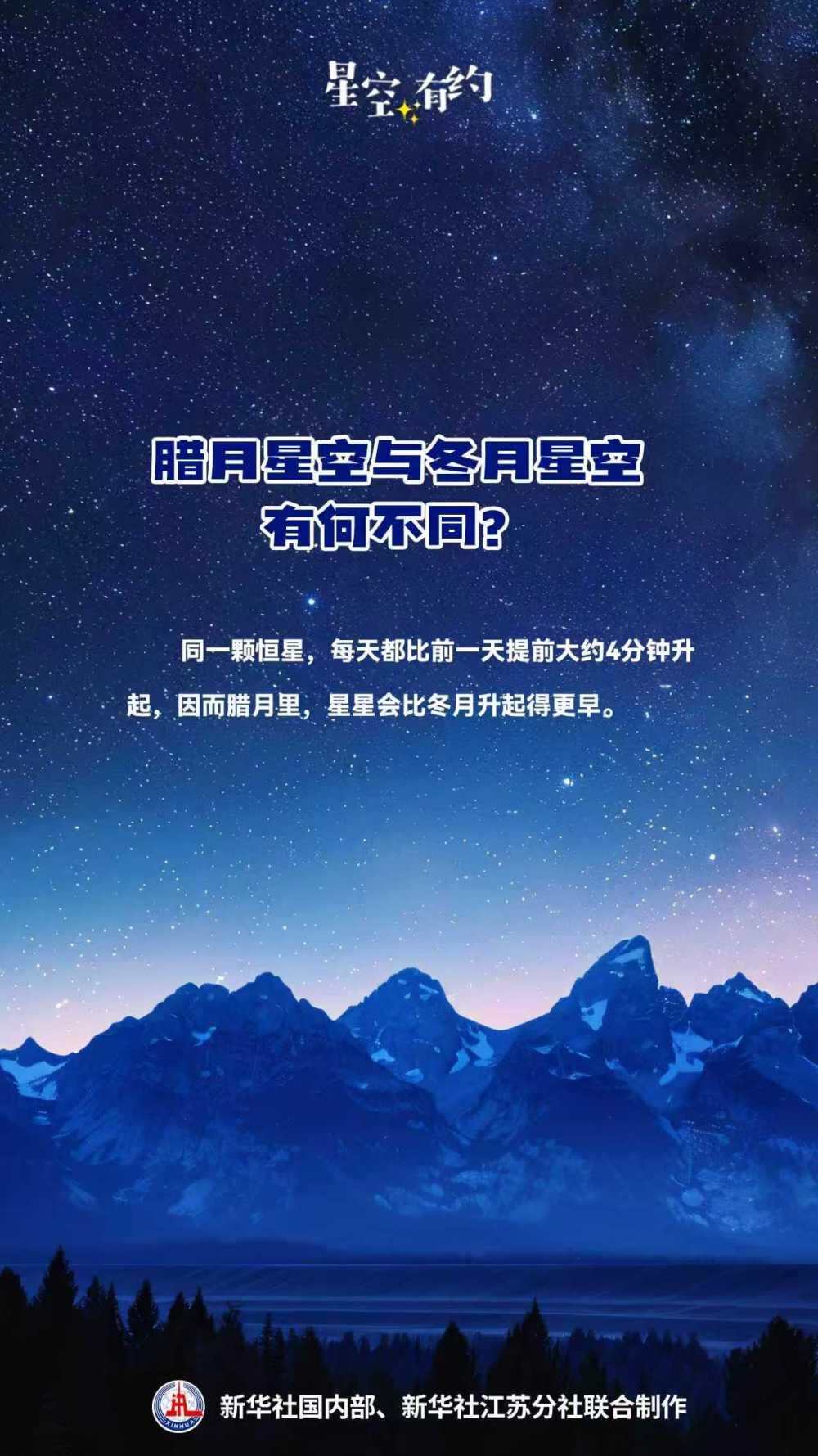 同一颗恒星,每天都比前一天提前大约4分钟升起,因而腊月里,星星会比冬月升起得更早。例如,今年1月下旬晚8点,天狼星已从东方升起,在地平线上约20度的位置,而2025年12月下旬晚8点,天狼星则刚从地平线升起。