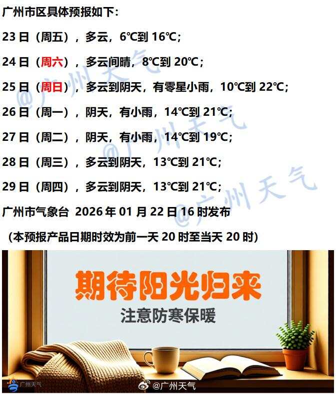 @广州天气预计,未来几天气温逐步回升,周六还有望见到阳光,周日多云到阴天,有零星小雨,晾晒要抓紧时间了。