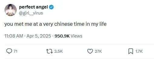 2025年4月,一位X网友发布了一条帖子,内容很简单:你在我人生中非常中国化的一个时期遇到我了。