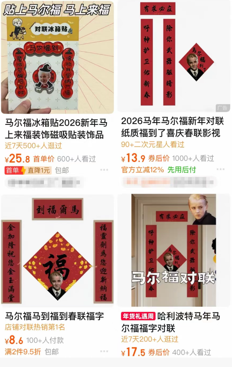 中国强大的供应链和电商平台迅速捕捉到这一文化现象的商业潜力。几乎在创意诞生的同时,淘宝等电商平台上已经涌现出各式各样的“马尔福春节周边”。商家们脑洞大开,推出了包括春联、贴纸、冰箱贴、徽章在内的多种产品,将原本的文字梗迅速转化为摸得着的商品。这些产品设计巧妙,既有传统春节元素,又融入了《哈利·波特》的魔法世界特征。