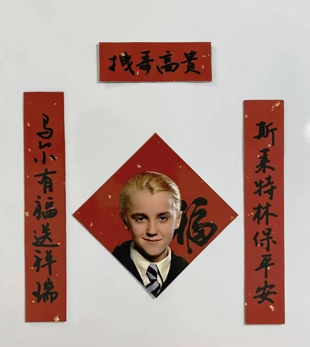 马尔福是J.K.罗琳创作的《哈利·波特》系列中的反派角色,来自霍格沃茨魔法学校的斯莱特林学院,拥有大量粉丝。有网友为这位斯莱特林“少爷”创作了专属春联:“马尔有福送祥瑞,斯莱特林保平安”。