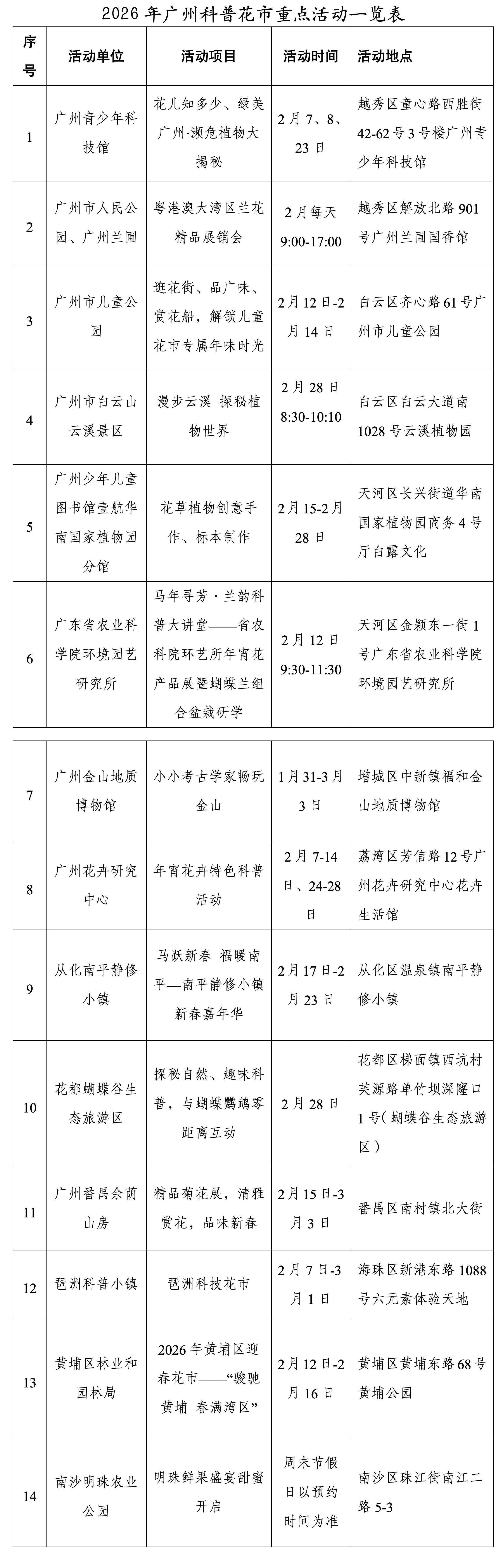 据了解,本次科普花市以“骐骥跃花城 科普启新春”为主题,精心策划“逛绿美公园·赏科普花市、游科普基地·享科学魅力、做科普志愿·筑青春梦想、当羊城拍客·晒科普之美、绘植物美图·识花草科趣、答花市趣题·赢科普好礼”六大板块,于1月31日至3月3日在全市范围内举行。