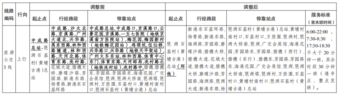 一、公共汽车旅游公交3线由中成路总站至琶洲石基村(黄埔古港)总站调整为琶洲石基村(黄埔古港)总站环线,至花城大道折返;服务时间调整为6:00-22:00,服务标准调整为早、晚高峰期(7:30-8:30、17:30-18:30)不大于20分钟一班,其余时段30分钟一班(逢半点、整点发班)。